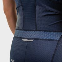 The Vent Tri Suit is made with new Tri Edge fabric that dries in no time. It also proves to be a great aerodynamic asset with its golf-ball structure, preventing air from staying close to the fabric. Ice pockets located near the rib cage help keep blood vessels cool when filled with ice from the feed zone. Since nutrition is as important as the swim, bike and run during a triathlon, new angled back pockets offer plenty of storage for bars and gels while preventing any loss during the race thanks to a tight elastic opening. The new Tri Air 2 chamois offers more padding in the front area for maximum comfort when riding in aero position. With a back made of highly breathable white mesh fabric, wearing the Vent Tri Suit keeps you cool when things get hot.